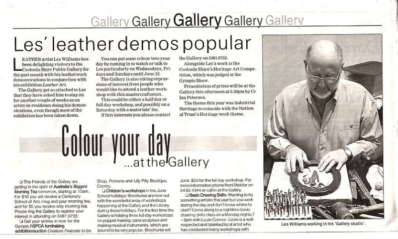 Les' leather demonstrations are popular at the Leather Art exhibition at the Cooloola Shire Public Gallery.